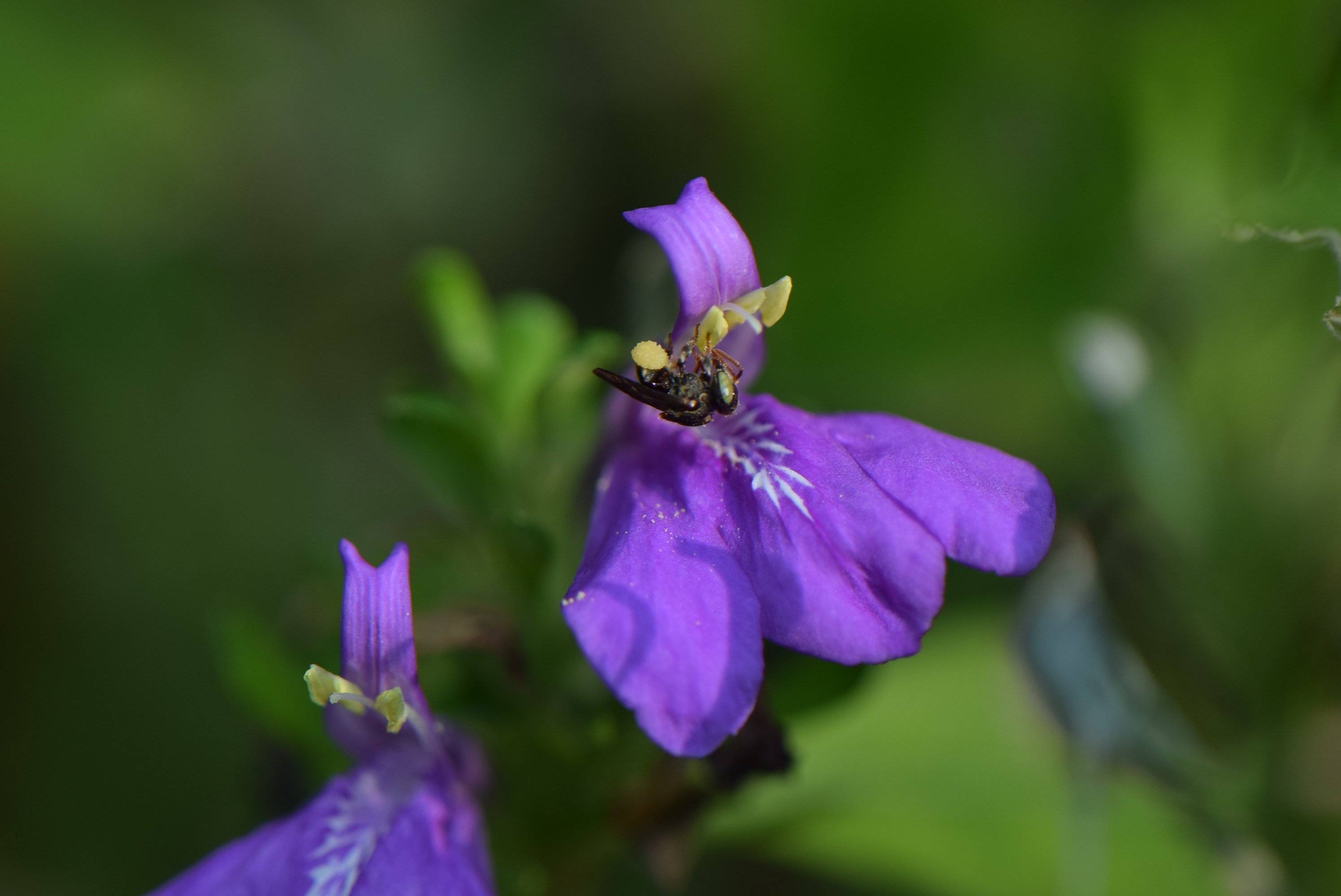 Many bees, especially solitary species, forage on flowers in search of pollen, which they collect and pack into specialized structures on their hind legs called corbiculae. This pollen is transported to their nests to feed their offspring and, during this process, is transferred from flower to flower, enabling plant fertilization and reproduction.